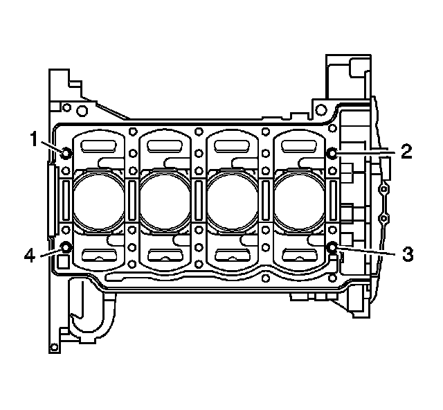 ^ Install the fixture plate (3), bolts (1), and bushing (2) onto the engine block deck. Position the fixture plate and bushing over the hole that is to be repaired (4).