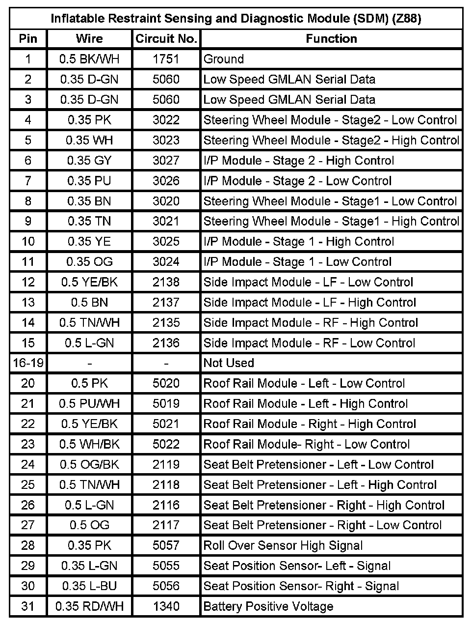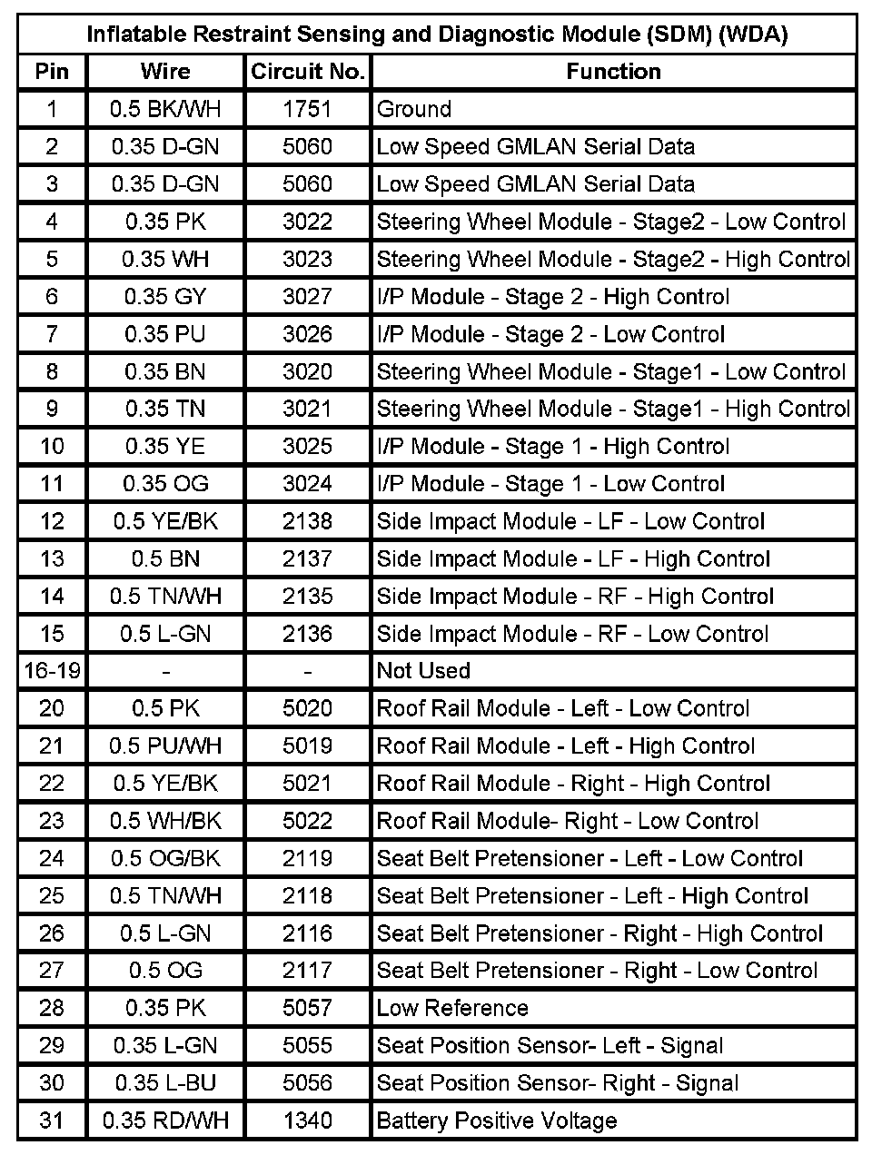 Inflatable Restraint Sensing And Diagnostic Module (SDM) (WDA) (Pin 1 To 31):