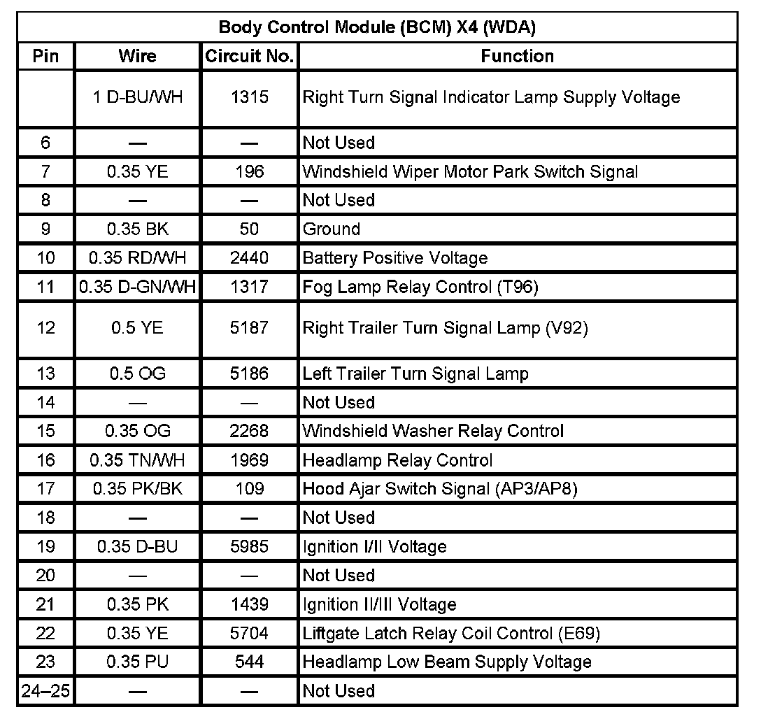 Body Control Module (BCM) X4 (With RPO Code WDA) (Pin 6 To 25):