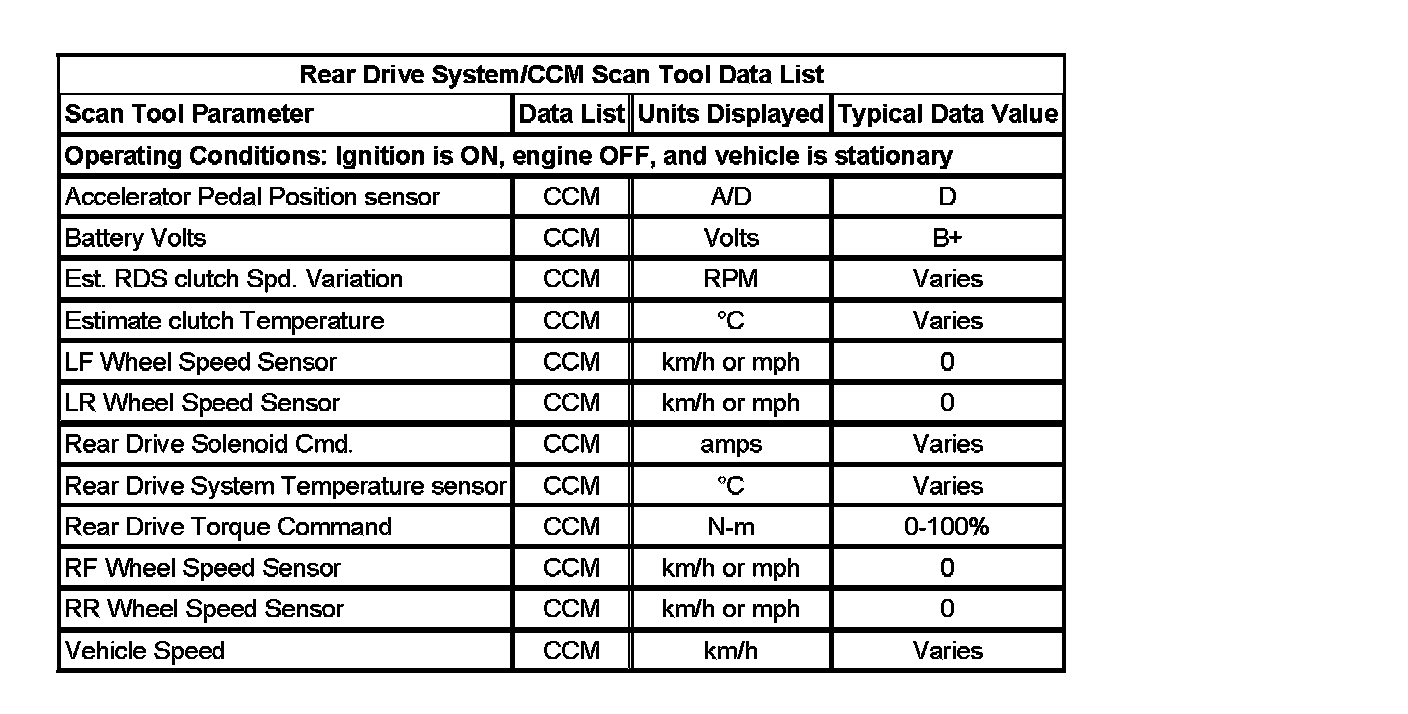 The rear differential clutch control module (CCM) Scan Tool Data Lists contain all the clutch control module system related parameters that are available on the scan tool. The parameters in the list are arranged in alphabetical order. The column, "Data List," indicates the location of the parameter within the scan tool menu selections.