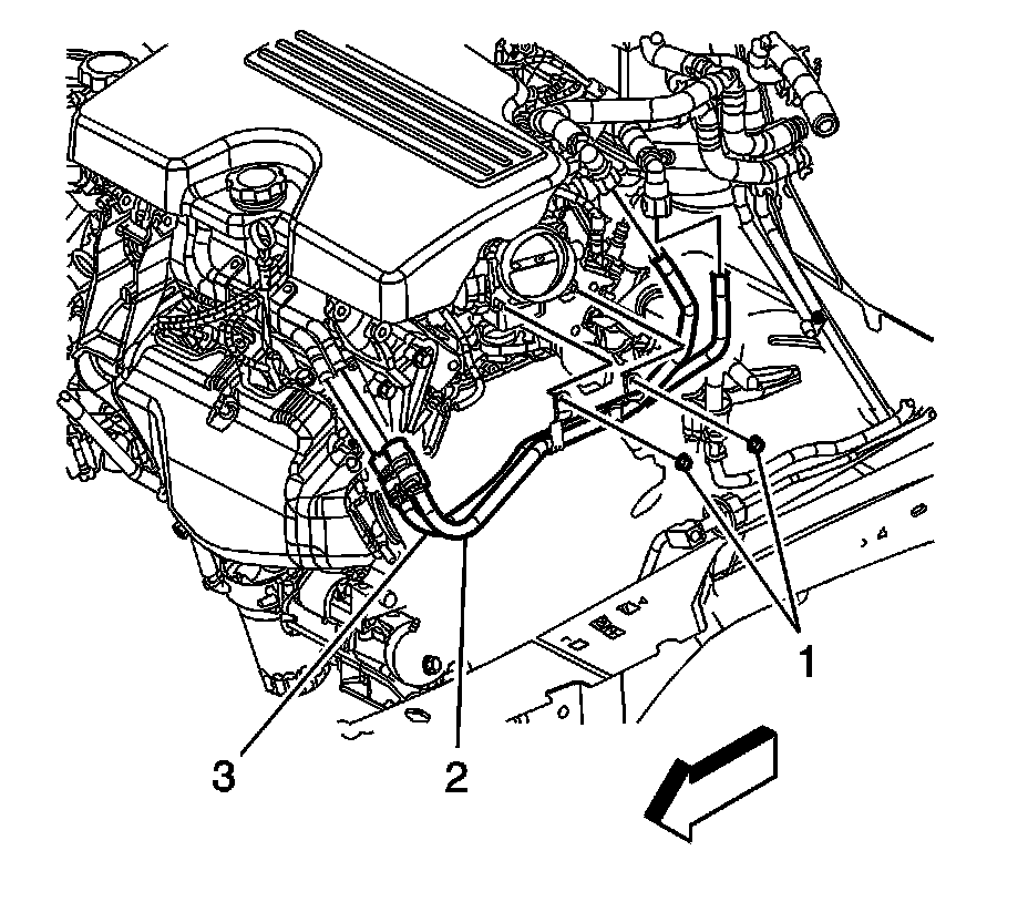 16. Remove the heater inlet and outlet pipe nuts (1) from the throttle body studs.