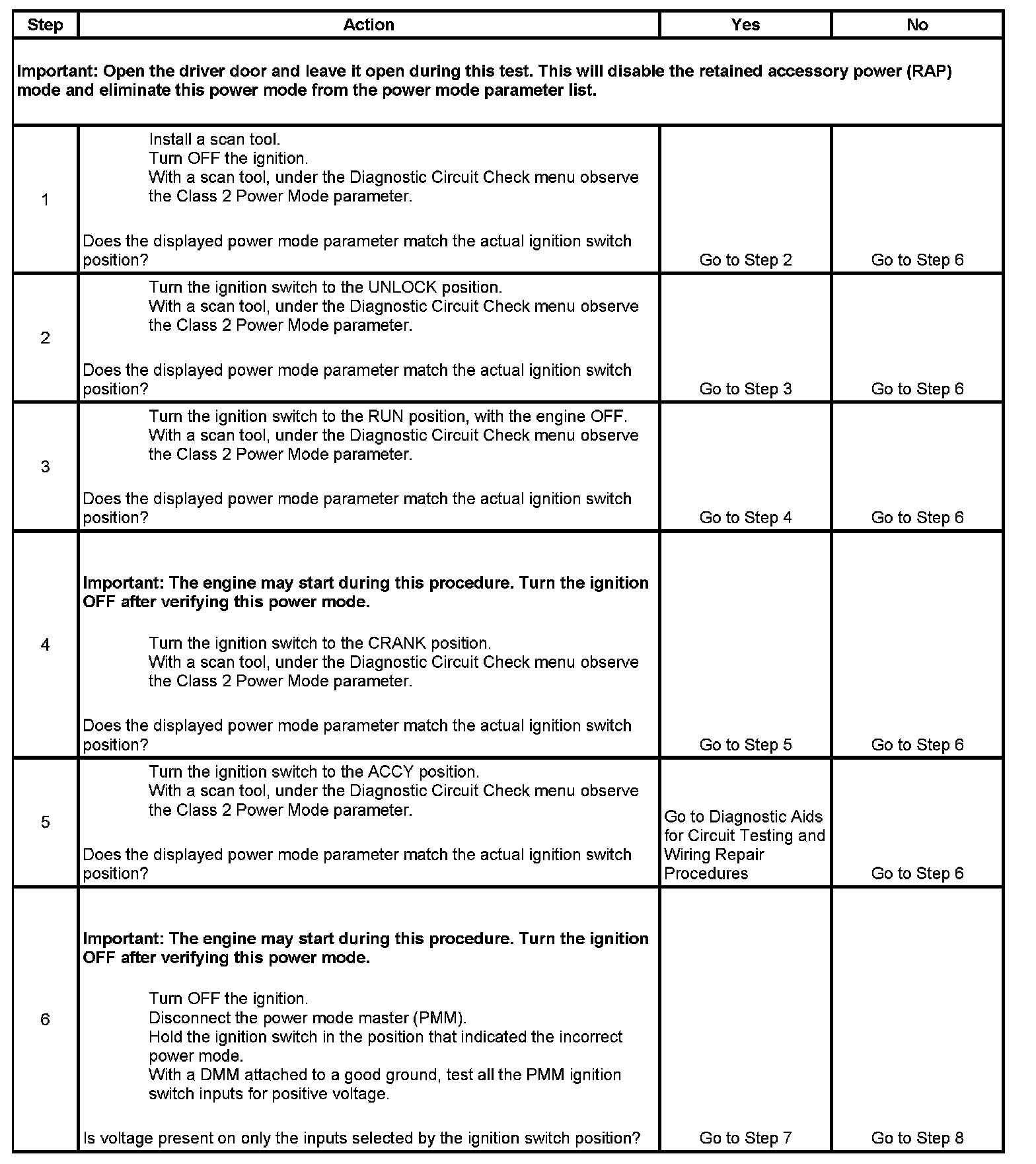 Normal vehicle serial data communications and module operations will not begin until the system power mode has been identified. Discrete wires from the ignition switch contacts are monitored by a module which acts as the power mode master (PMM) in order to determine the correct power mode. The module which is the PMM communicates the system power mode to all modules on the serial data lines. Refer to Body Control System Description and Operation to identify which module is the PMM and the applicable power mode look up table.