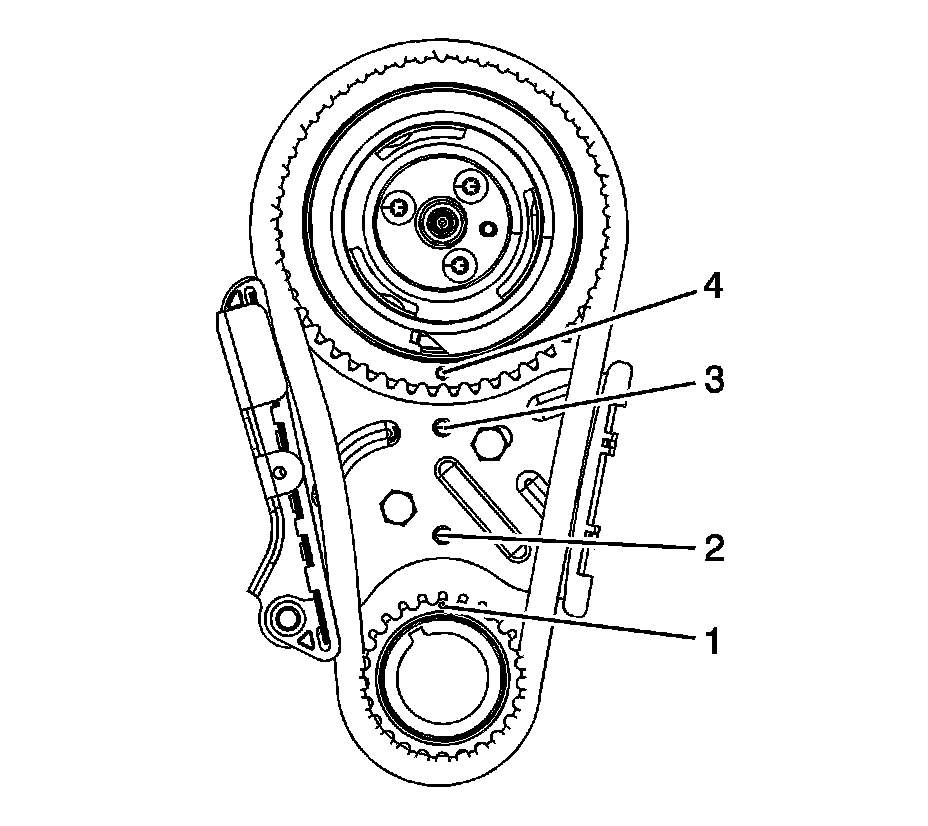 ^ Align the timing mark on the camshaft gear (4) with the timing mark on top of the timing chain tensioner (3).