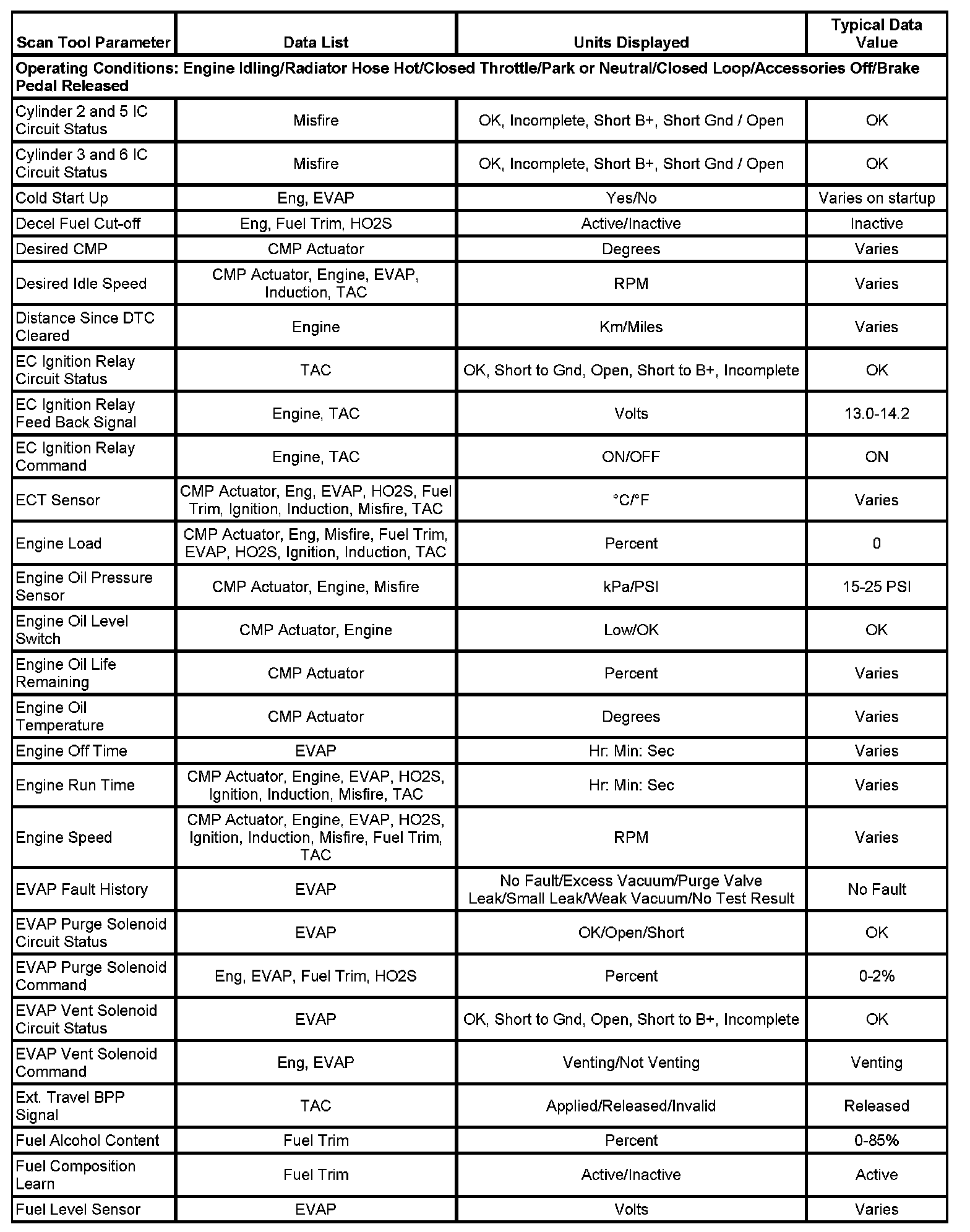 The Engine Scan Tool Data List contains all engine-related parameters that are available on the scan tool. The list is arranged in alphabetical order. A given parameter may appear in any one of the data lists, and in some cases may appear more than once, or in more than one data list in order to group certain related parameters together.