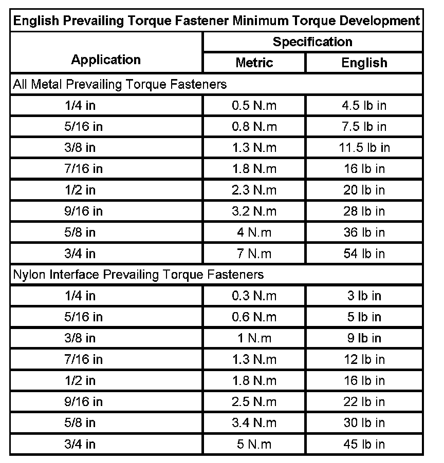 English Prevailing Torque Fastener Minimum Torque Development