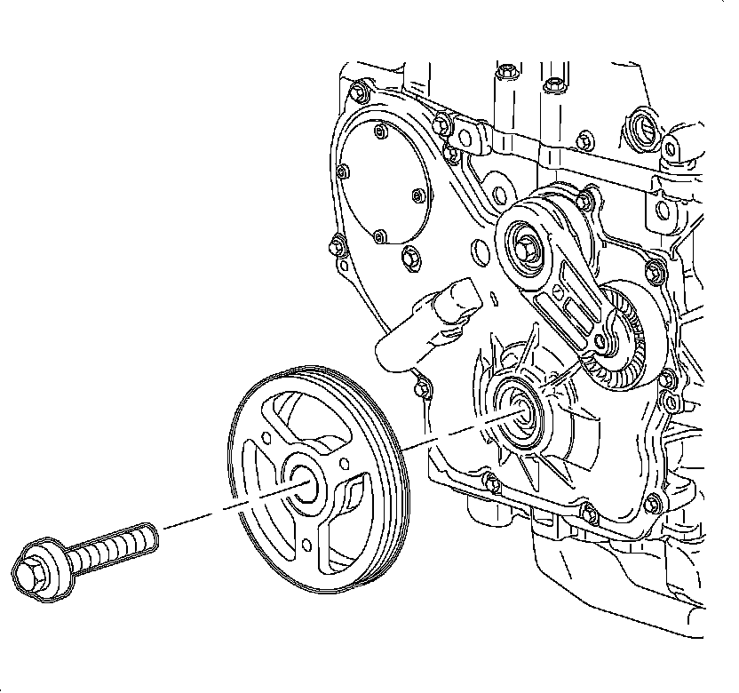 Important: The crankshaft balancer pulley bolt head and washer assembly prevents oil leakage at the center of the pulley. Do not damage the sealing surfaces. If the pulley cannot be removed by pulling with your hand, use a 3-jaw puller.