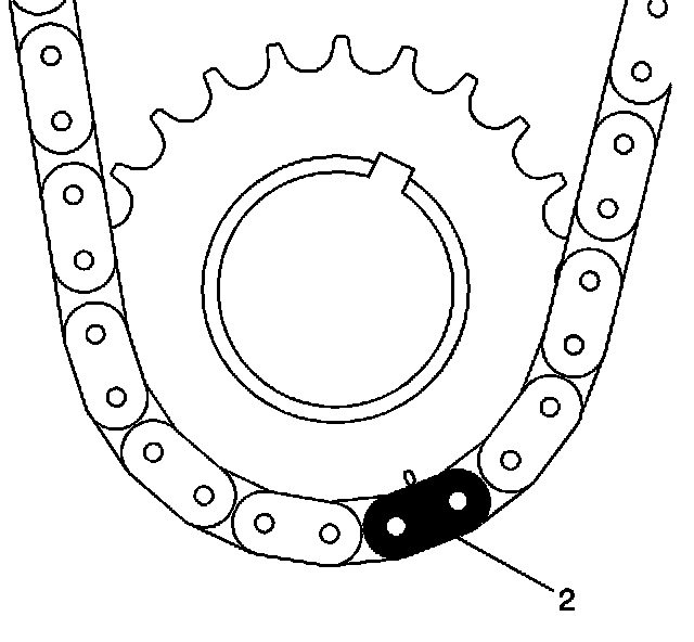 ^ Route the timing chain around the crankshaft sprocket and line up the first matching colored link (2) with the timing mark on the crankshaft sprocket, in approximately the 5 o'clock position.