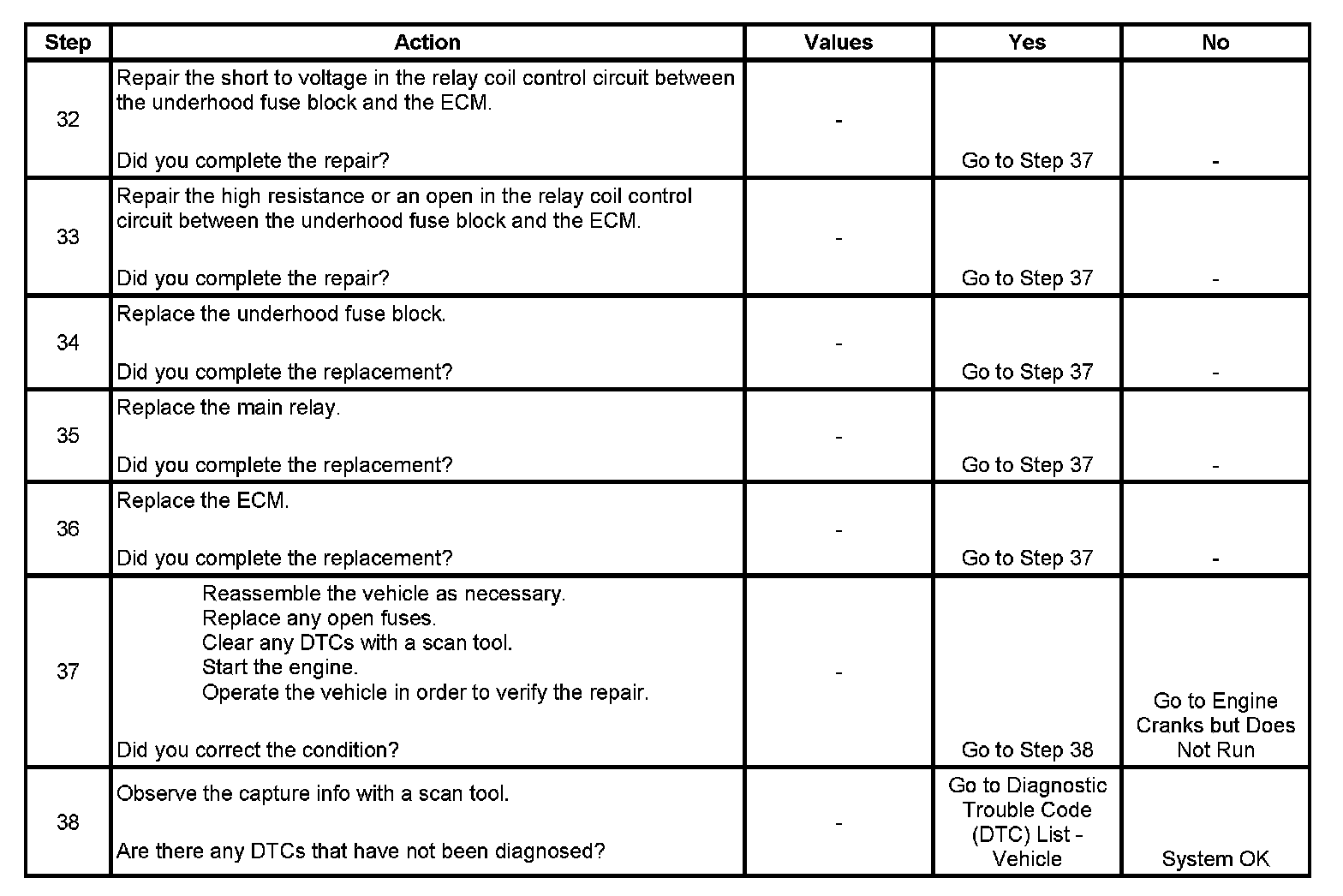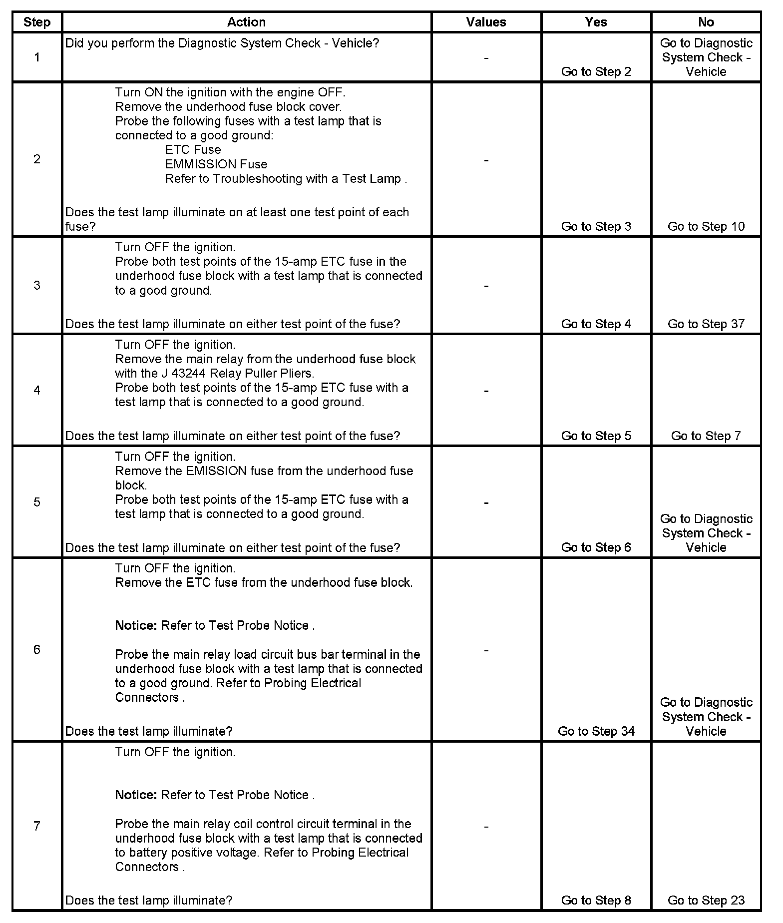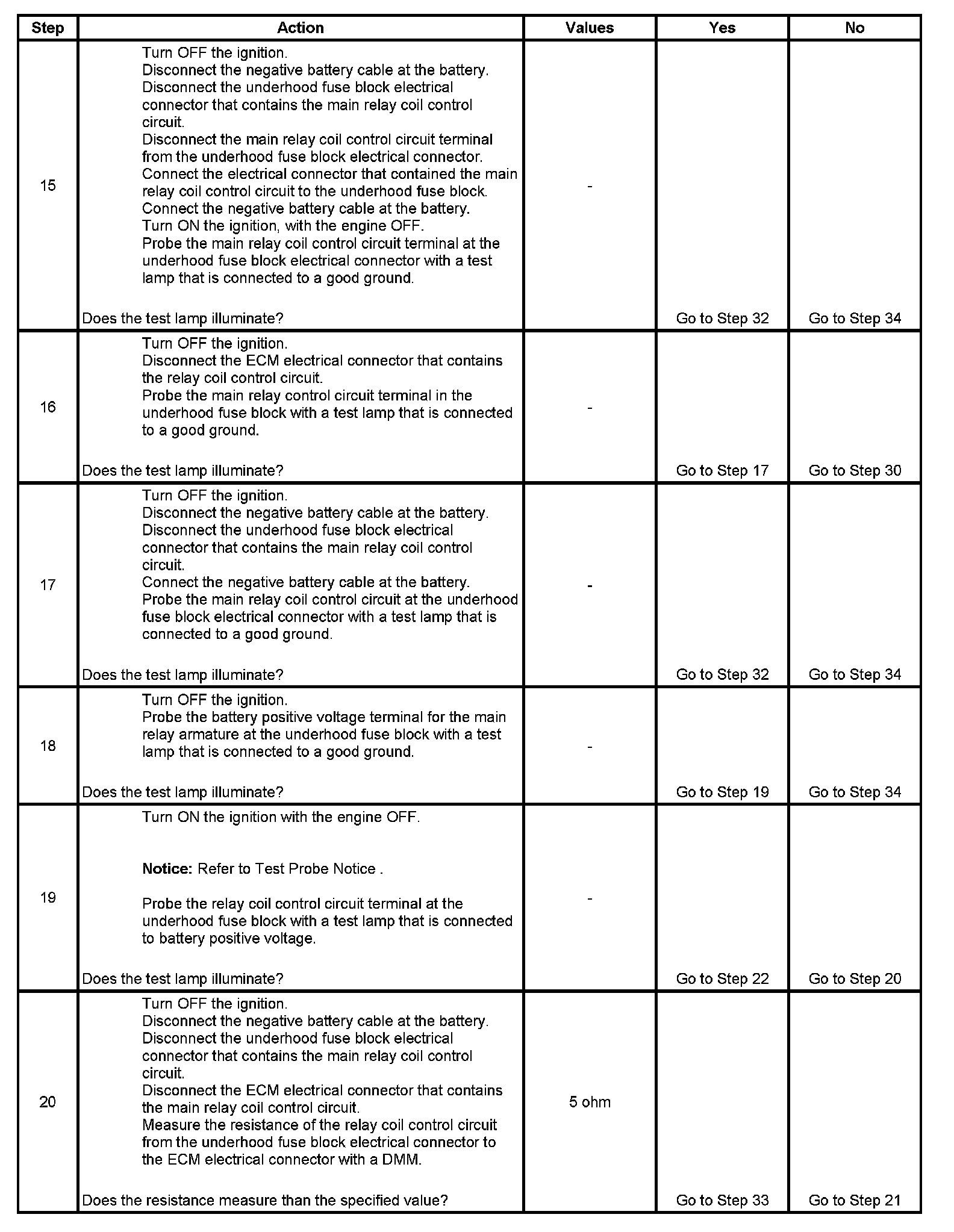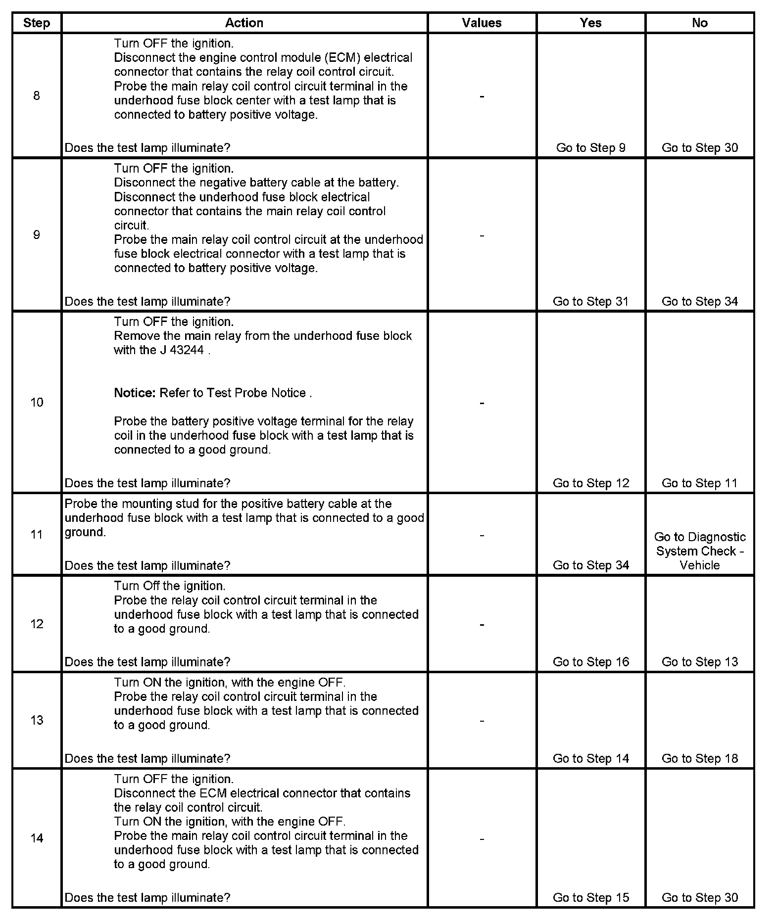 The main relay system diagnosis table assumes that the vehicle battery is fully charged. Refer to Battery Inspection/Test (Side Terminal Battery) Battery Inspection/Test (Top Post Terminal Battery).