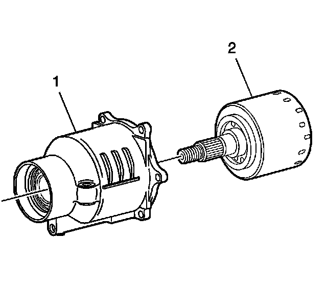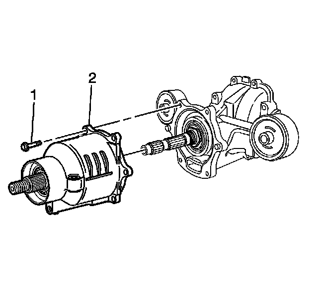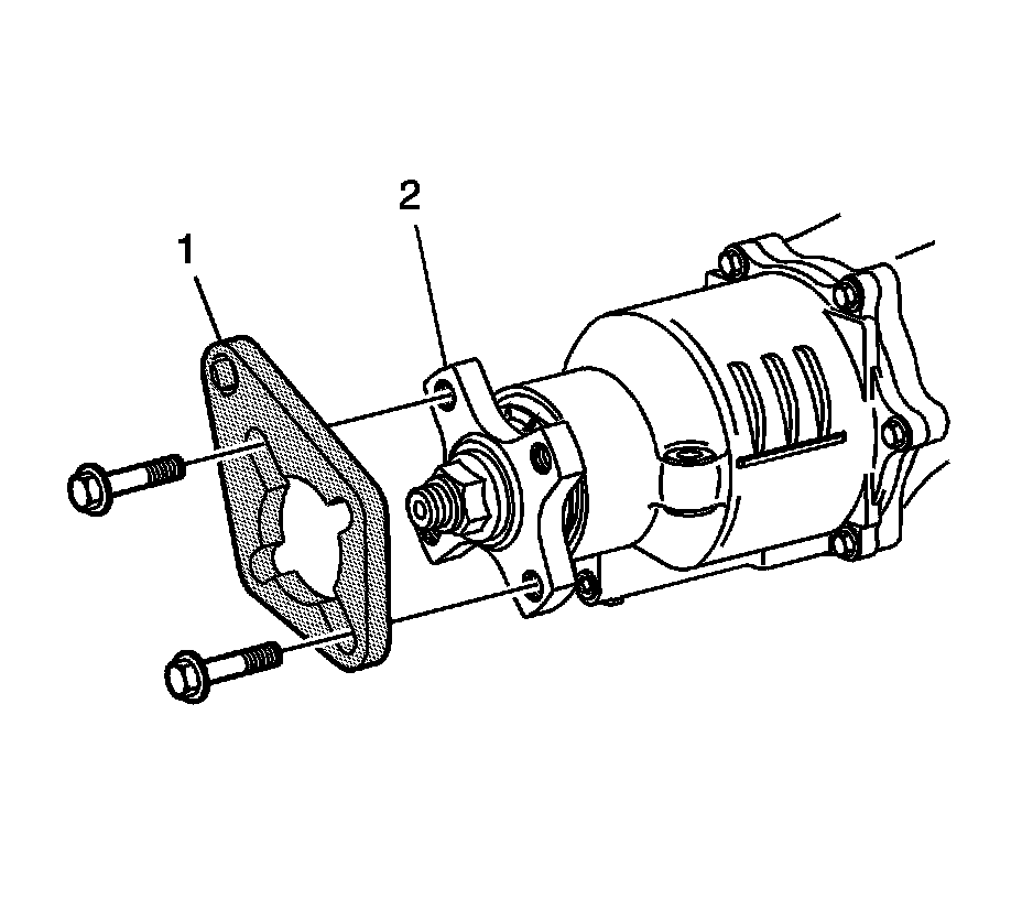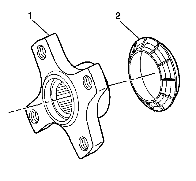 12. Install the J 44873 (1) to the pinion flange (2) using the J 44873-2 shoulder bolts.