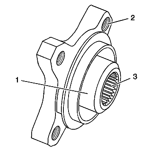 21. Check the pinion flange sealing surface (1) for wear or gouges, the bolt threads (2) for damage and the pinion splines (3) for worn or damaged splines.