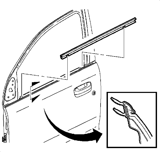 1. Align the outer belt seal fastener location with the hole in the door structure and outer panel retaining tabs.