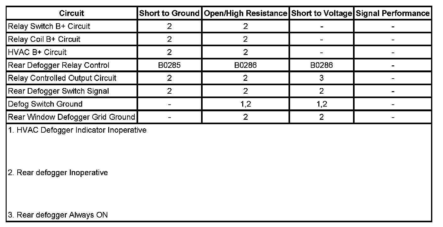 • If the test lamp does not illuminate, test the relay switch B+ circuit for a short to ground or an open/high resistance. If the circuit tests normal and the REAR DEFOG fuse is open, test the relay controlled output circuit for a short to ground.