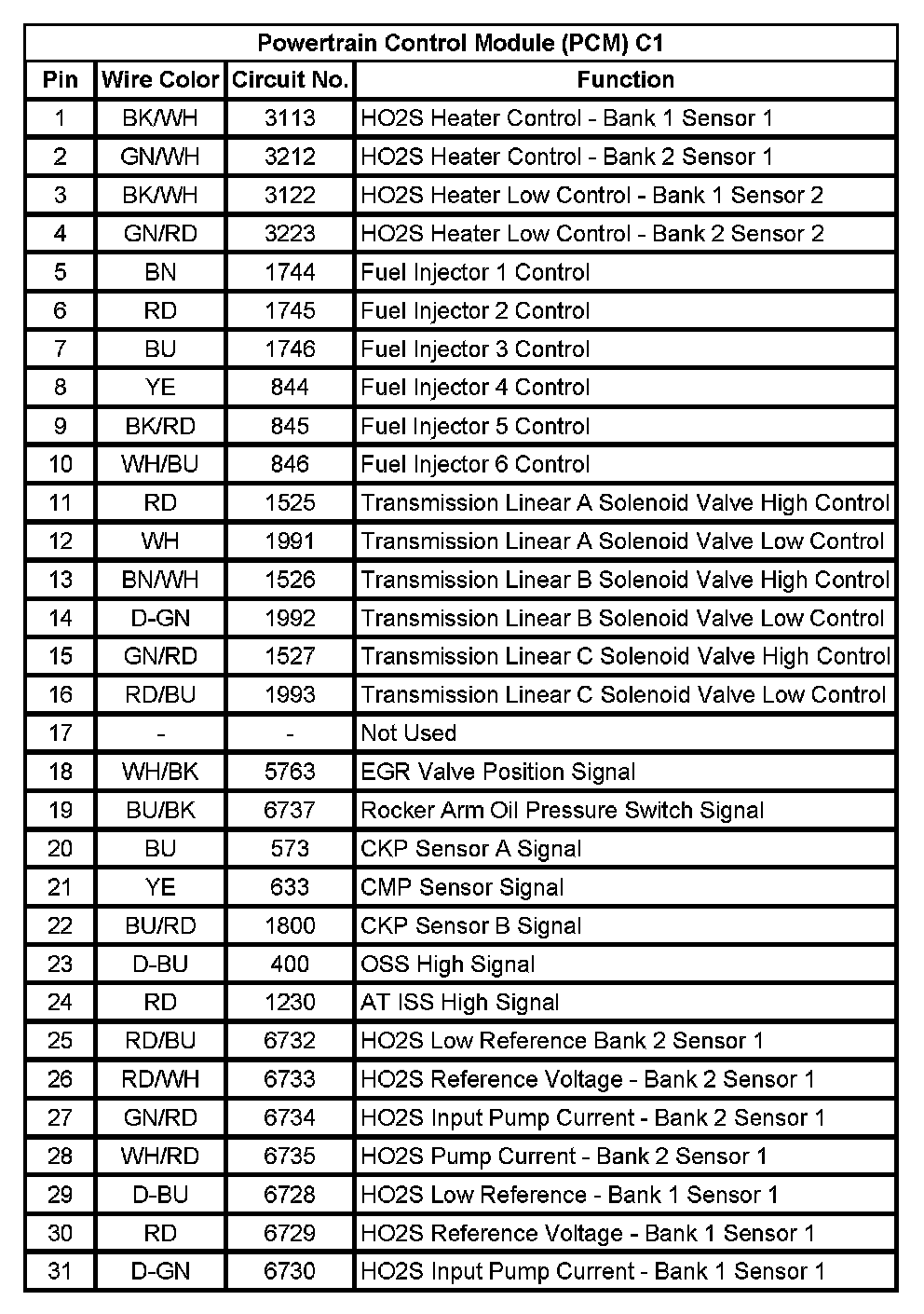Powertrain Control Module (PCM) C1 (Pin 1 To 31):
