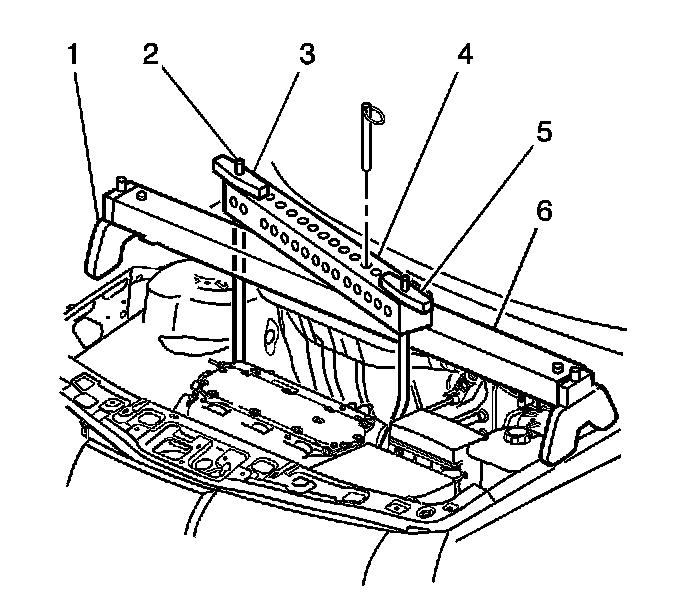 1. Install the engine support fixture long bar (6) to the vehicle.