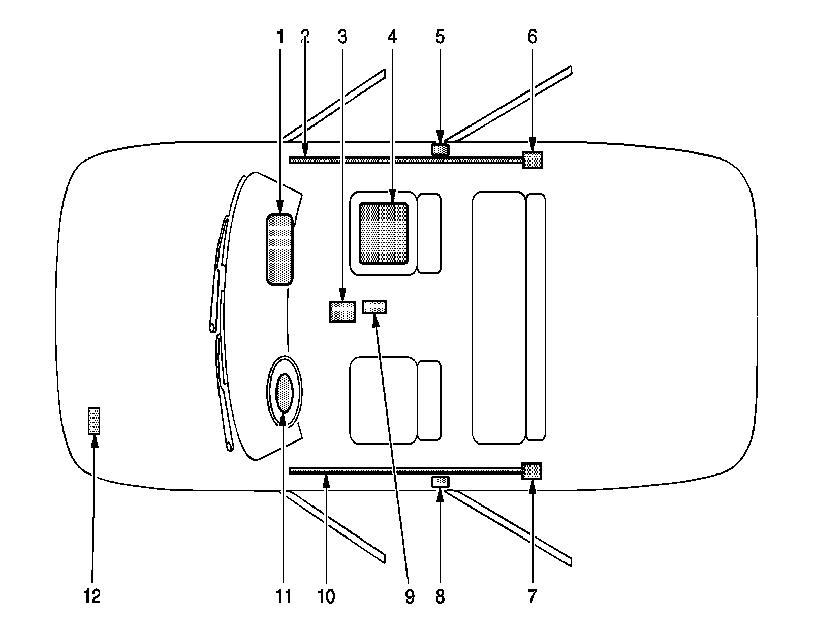 2 - Right Roof Rail Air Bag-Located under the headliner, extending from the passenger front windshield pillar to the passenger rear windshield pillar