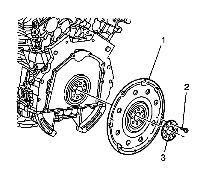 1. Position the flywheel (1) and flywheel washer (3) on the crankshaft as previously noted.