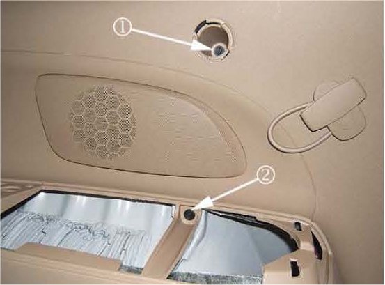 There are two hidden screws, one screw (1) is behind the cargo screen retainer and the second screw (2) is under the armrest. The cargo retainer will need to be removed by turning, twisting and pulling outward to release the retainer. The electrical connector for the rear speaker and outlet will also need to be disconnected prior to removing the panel.