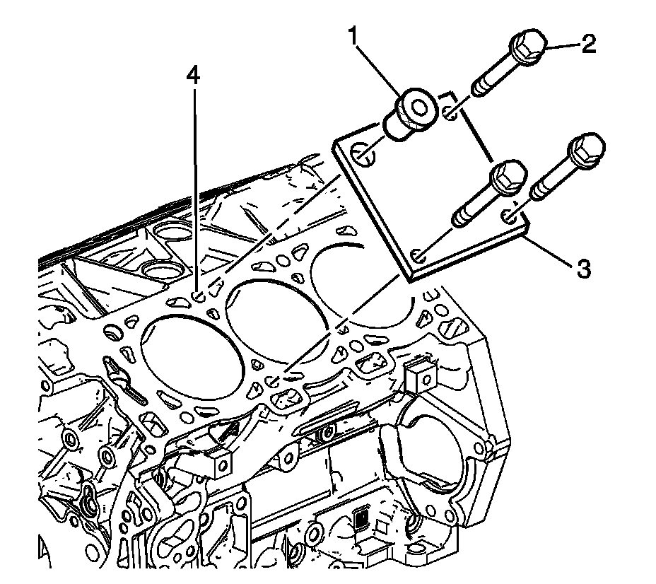 1. Position the fixture plate (3) with the bushing (1) installed over the cylinder head bolt hole to be repaired (4).