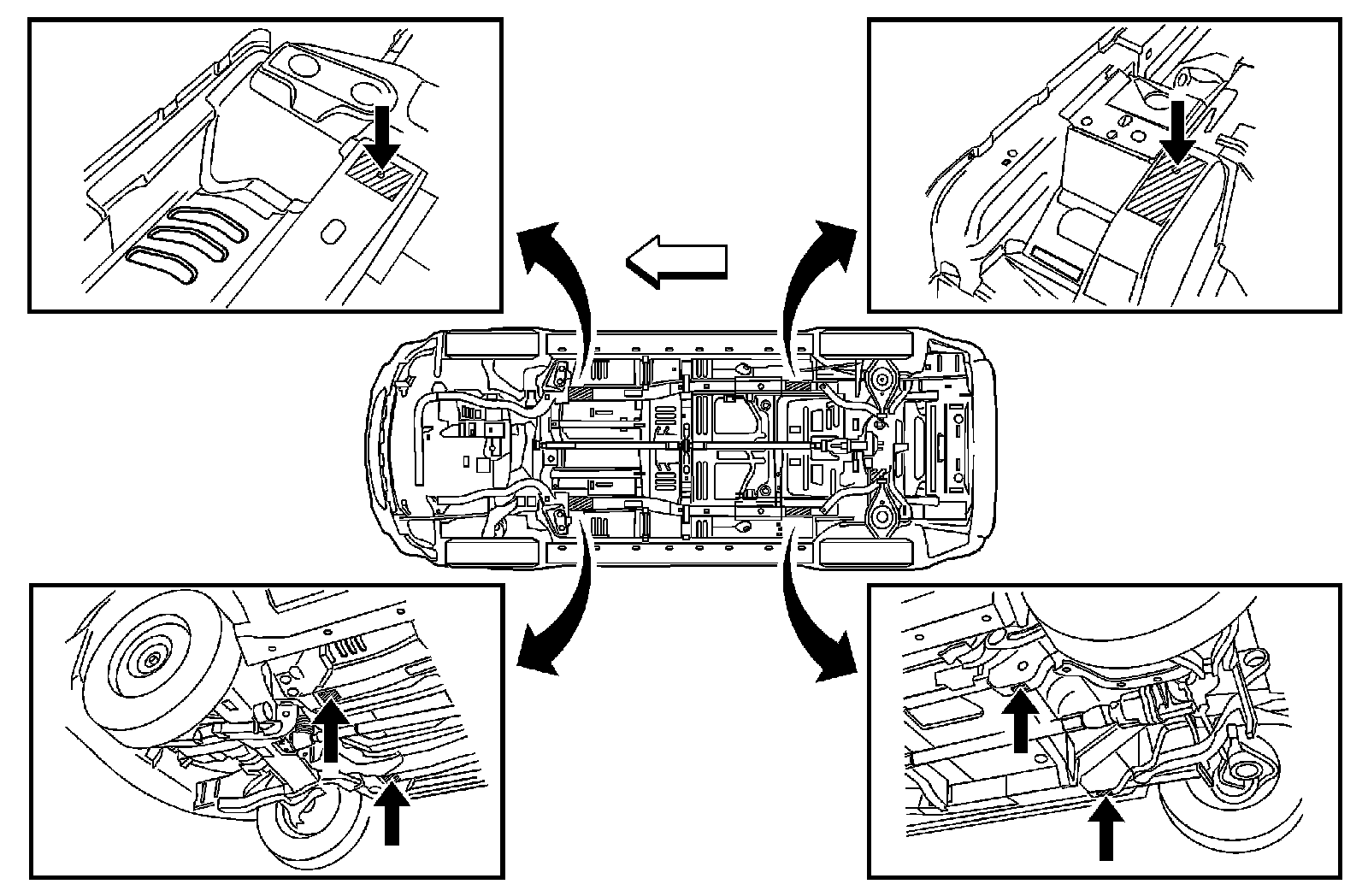 * Perform the vehicle lifting or jacking procedure only at the identified lift points. DO NOT allow the lifting equipment or jacking equipment to contact any other vehicle components.