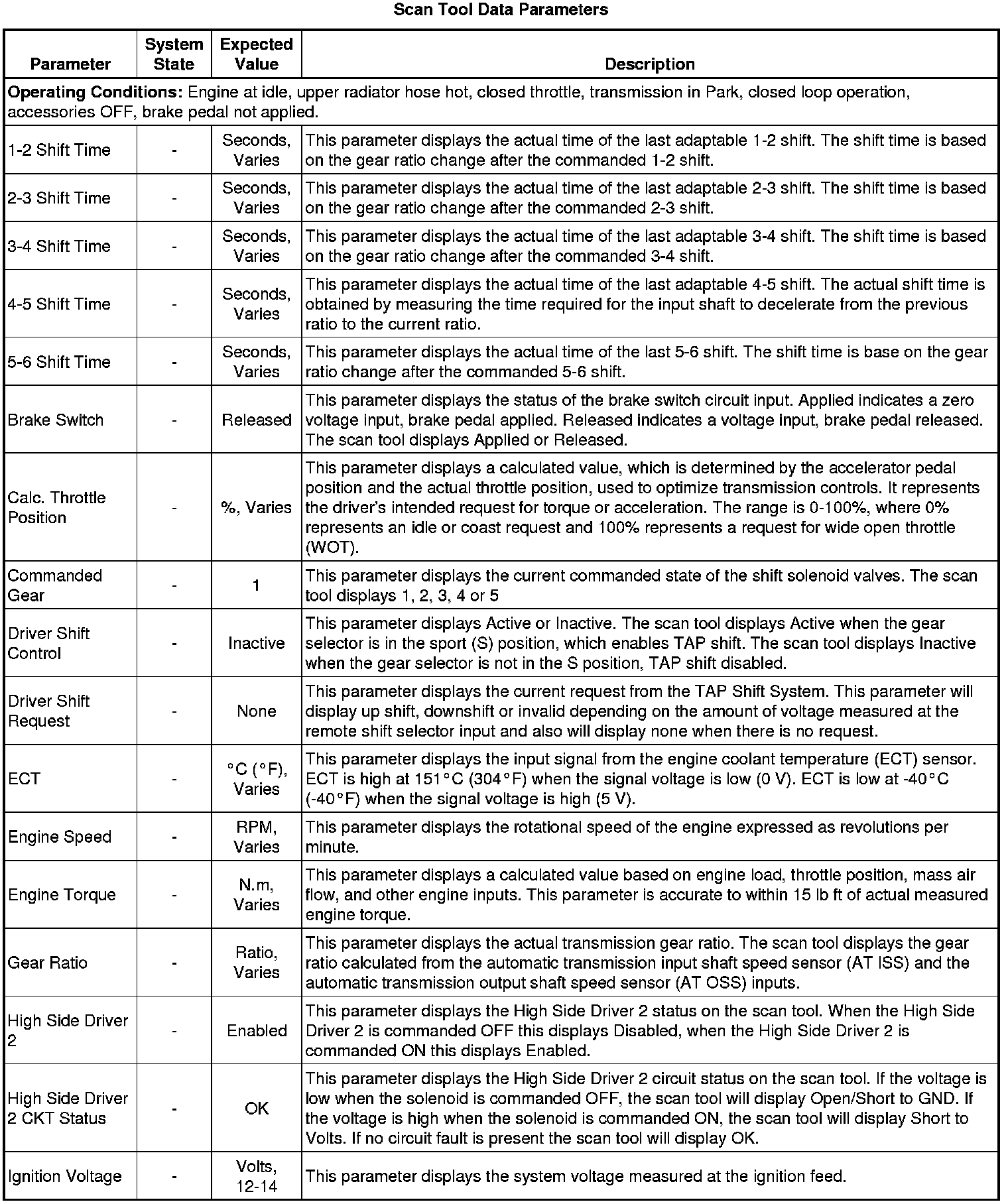 The scan tool values from a properly functioning transmission may be used for comparison with the transmission you are diagnosing. The values below represent a typical display recorded from a properly functioning system.