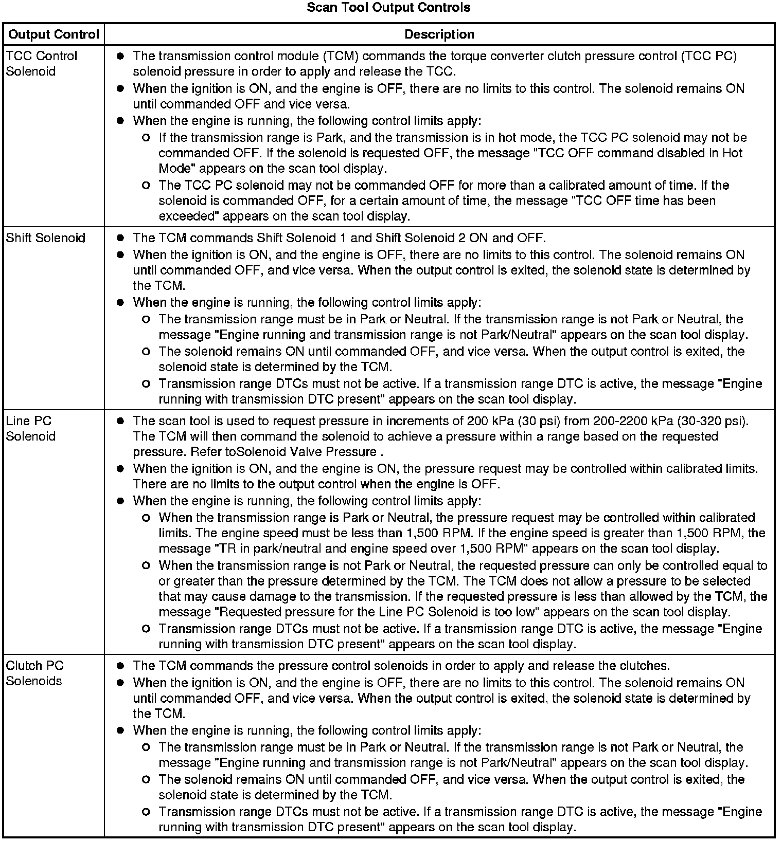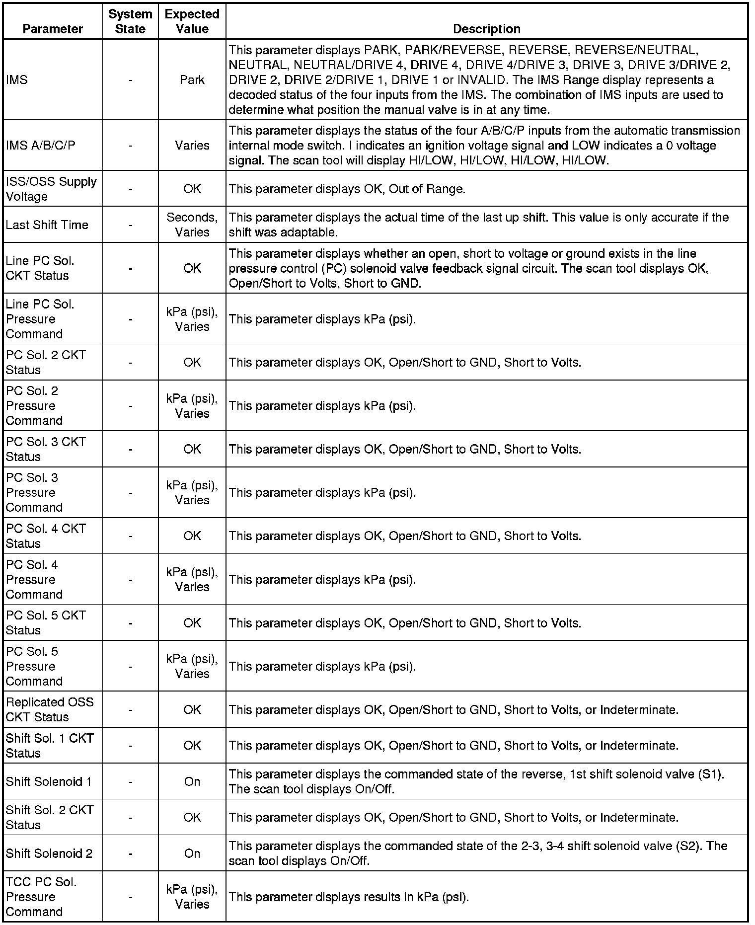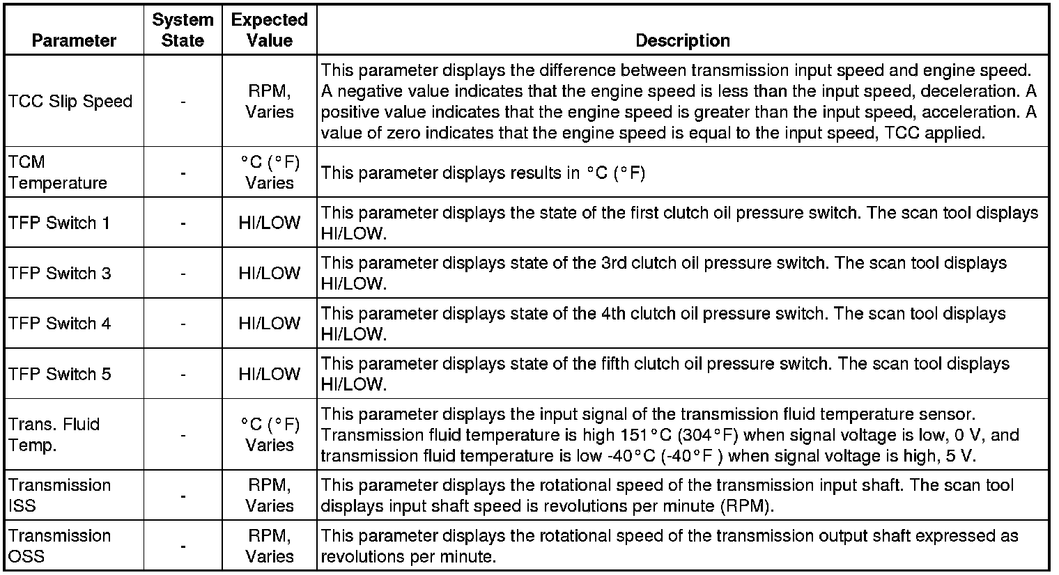 The Transmission Control Module Scan Tool Data List contains all transmission related parameters that are available on the scan tool. The list is arranged in alphabetical order. A given parameter may appear in any one of the data lists, and in some cases may appear more than once, or in more than one data list in order to group certain related parameters together.