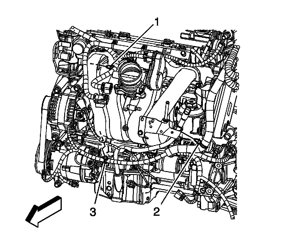 6. Disconnect the engine harness clips (1 and 3) from the intake manifold.