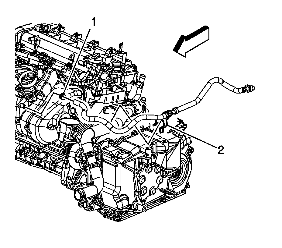 12. Position the vacuum brake booster hose clamp (2) at the intake manifold.