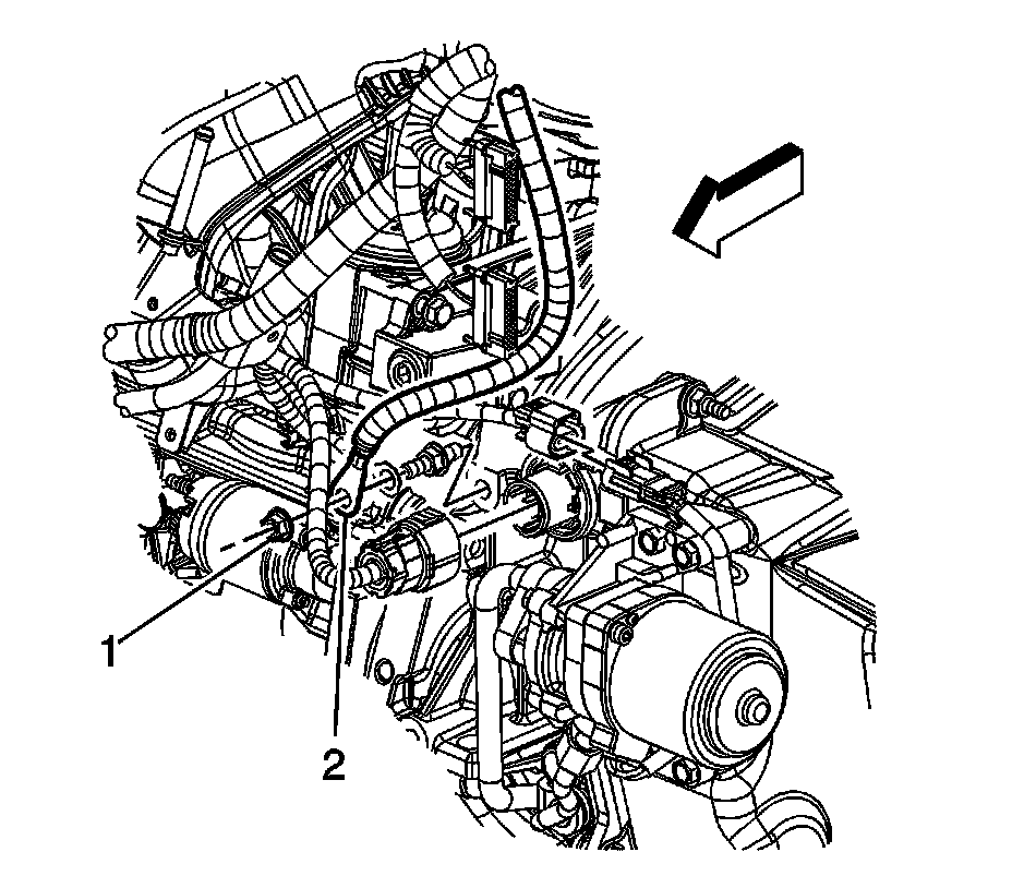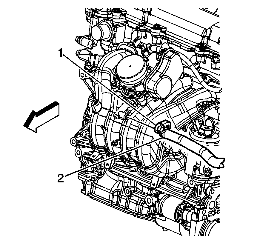 10. Remove the vacuum brake booster hose (2) from the intake manifold. Reposition the brake booster hose out of the way.