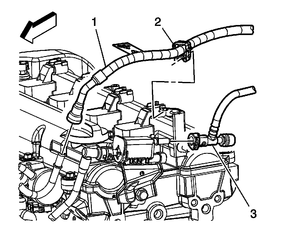 4. Disconnect the evaporative emission (EVAP) line (3) quick connect fitting from the EVAP purge solenoid. Refer to Plastic Collar Quick Connect Fitting Service (Plastic Collar Quick Connect Fitting Service) .