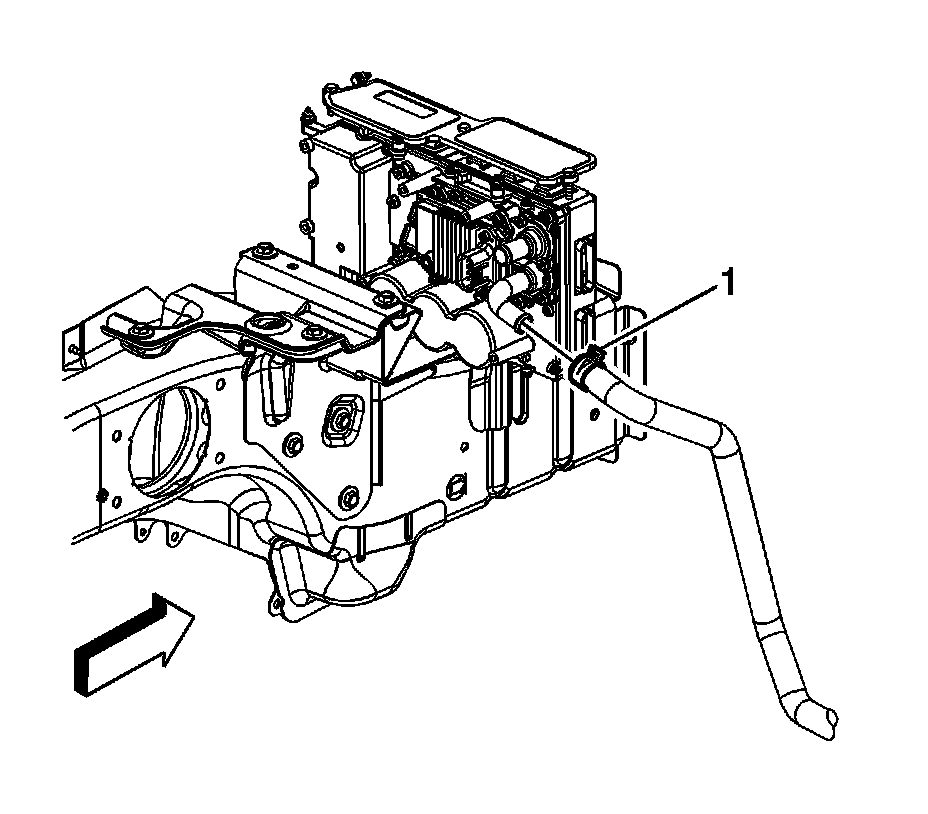 9. On all engines, reposition the vacuum brake booster hose clamp (1) at the intake manifold.