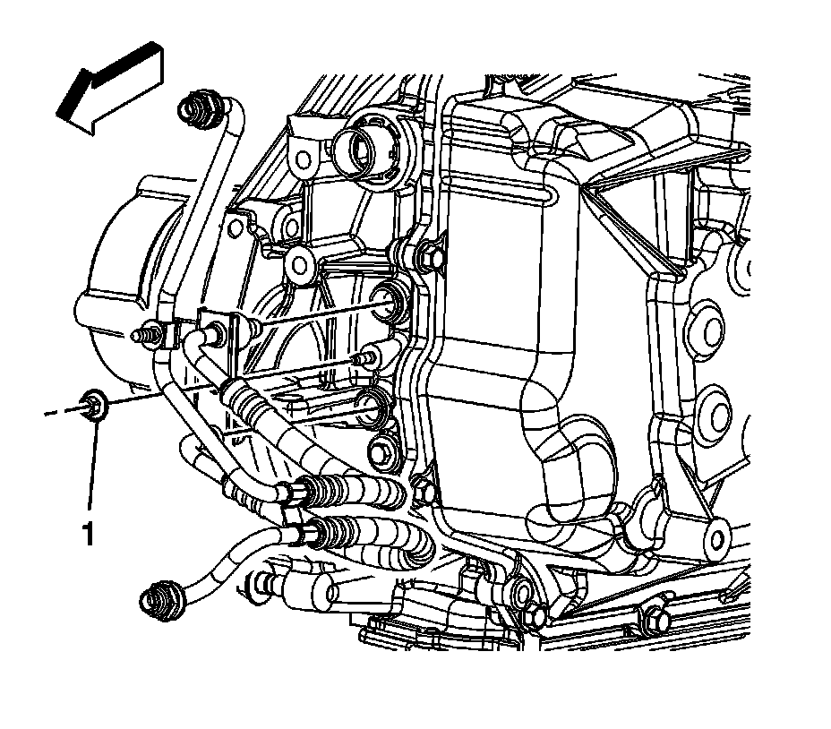 48. Remove the transaxle oil cooler line to transaxle nut (1).