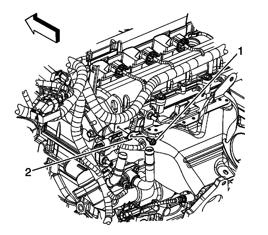 11. Remove the coolant recovery inlet hose clamp (2) at the cylinder head.