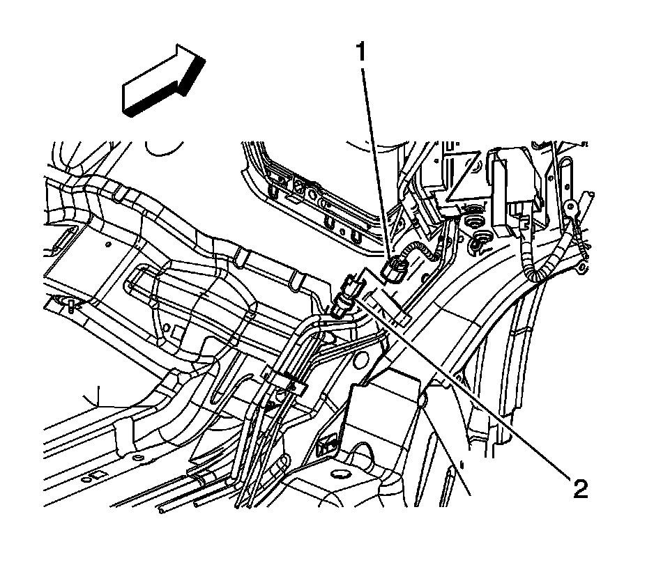 4. Disconnect the chassis evaporative emission (EVAP) line quick connect fitting (2) from the EVAP canister purge solenoid valve. Refer to Plastic Collar Quick Connect Fitting Service (Plastic Collar Quick Connect Fitting Service) .