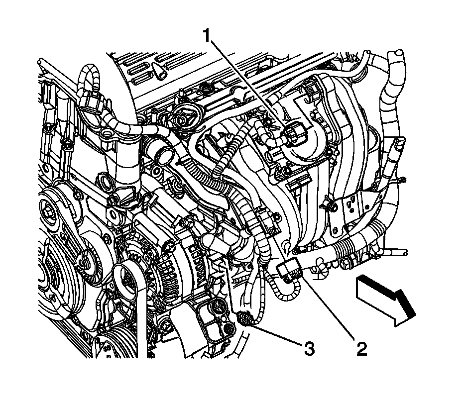 6. Disconnect the engine harness clips (1 and 3) from the intake manifold.