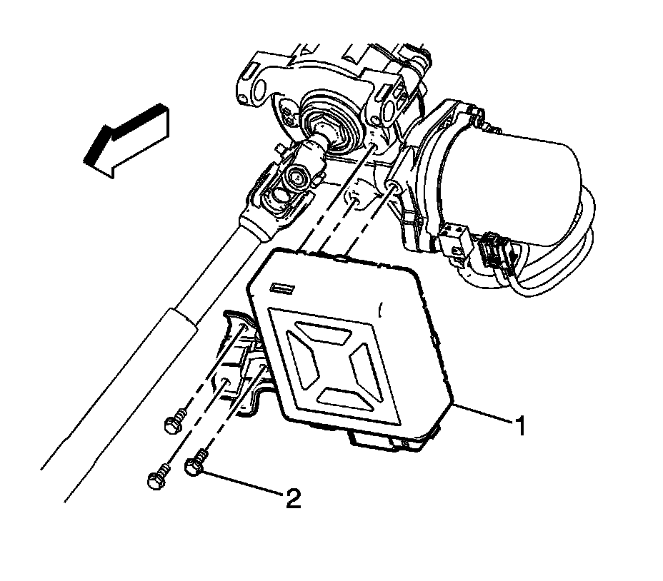4. If equipped with an electronic power steering column, remove the 3 electronic power steering motor control module bracket bolts (2) and the electronic power steering motor control module and bracket assembly (1).