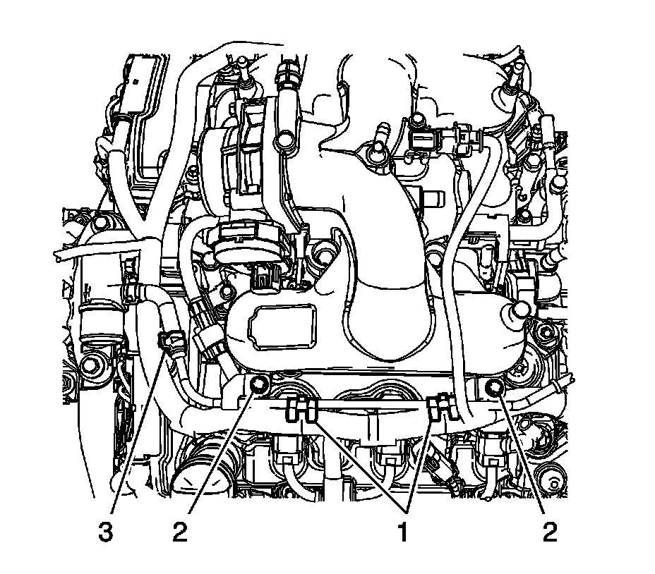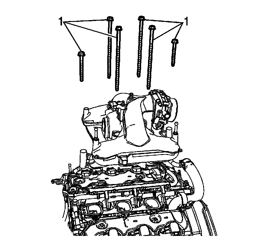 4. Install the upper intake manifold bolts (1) and tighten to 25 Nm (18 lb ft).