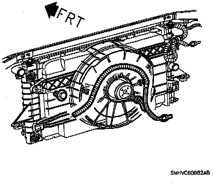 11. Install fan motor electrical connector. Install wiring harness to fan shroud and radiator end tank.