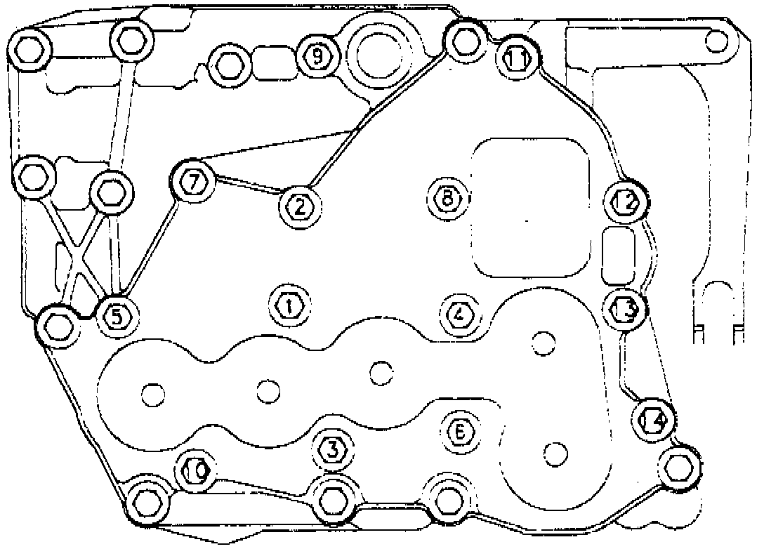 6. Tighten valve body to case attaching bolts in sequence to specifications.