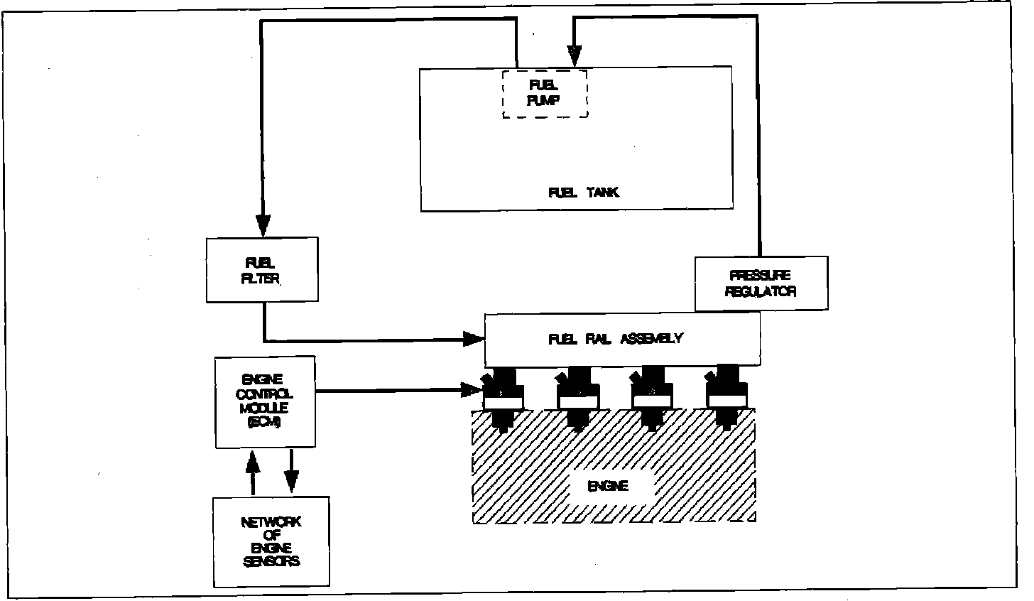 The PCM controls fuel by receiving input signals from various sensors. It then takes this information and calculates the amount of fuel required to achieve a specific air/fuel ratio. The PCM controls the fuel flow into the engine by controlling four fuel injectors on the multi-port fuel injection (MFI) system. The PCM pulses the injectors at least once every crankshaft revolution.