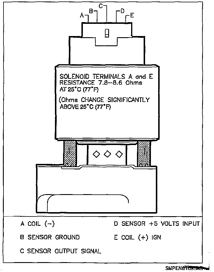 The solenoid (bobbin and coil) assembly is energized by current which enters the valve through an electrical connector (terminal "E"), then flows through the solenoid assembly to the control module and creates an electromagnetic field. This field causes the armature assembly to be pulled upward, lifting the pintle a variable amount off the base.