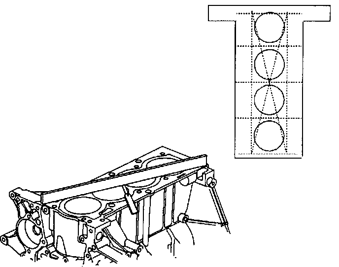 1. Inspect top of cylinder block for flatness. Using a precision straight edge and feeler gage, measure the surfaces contacting the cylinder head gasket for warpage.
