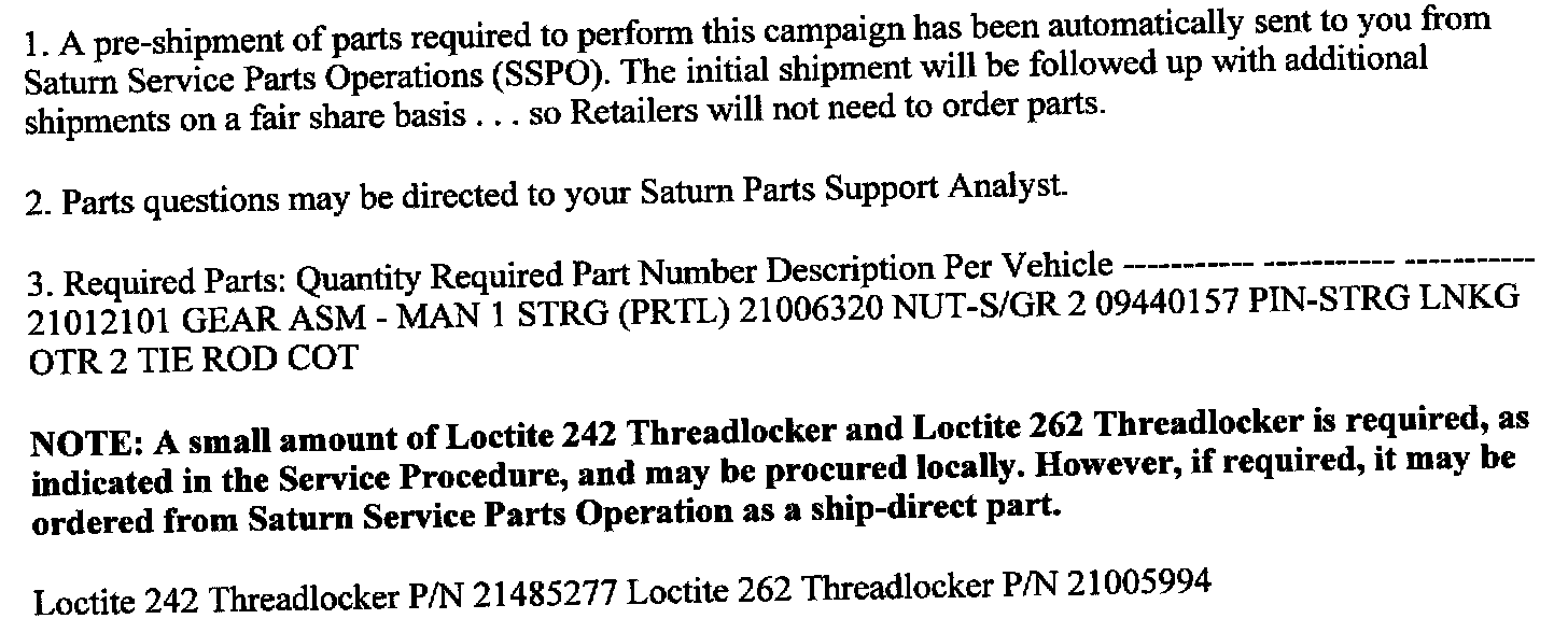 As you know, Saturn's success hinges upon our ability to execute superior customer support throughout the ownership experience, especially when important corrective actions such as this are required. It is imperative that every effort is made to accommodate the affected owners. If you have any questions, please coordinate with the Saturn Assistance Center to help ensure customer satisfaction.