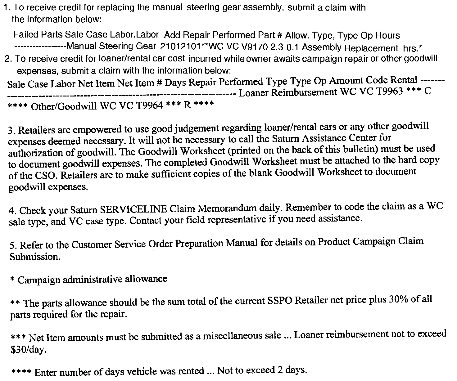 To avoid having to provide these burdensome solutions, every effort must be made to promptly schedule an appointment with each owner and to repair their vehicle as soon as possible. As you will see in reading the copy of the owner letter, owners are being instructed to contact the Saturn Assistance Center if their Retailer does not remedy the condition within five (5) days of the service date. If the condition is not remedied within a reasonable time, owners are instructed how to contact the National Highway Traffic Safety Administration.