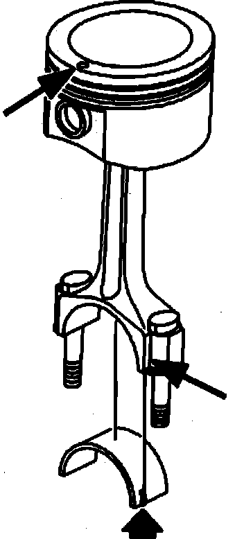 Assemble the piston and connecting rod by aligning the mark on top of the piston with the front of the engine. Assemble connecting rod to the piston with the bearing tang slots directed toward the exhaust manifold,