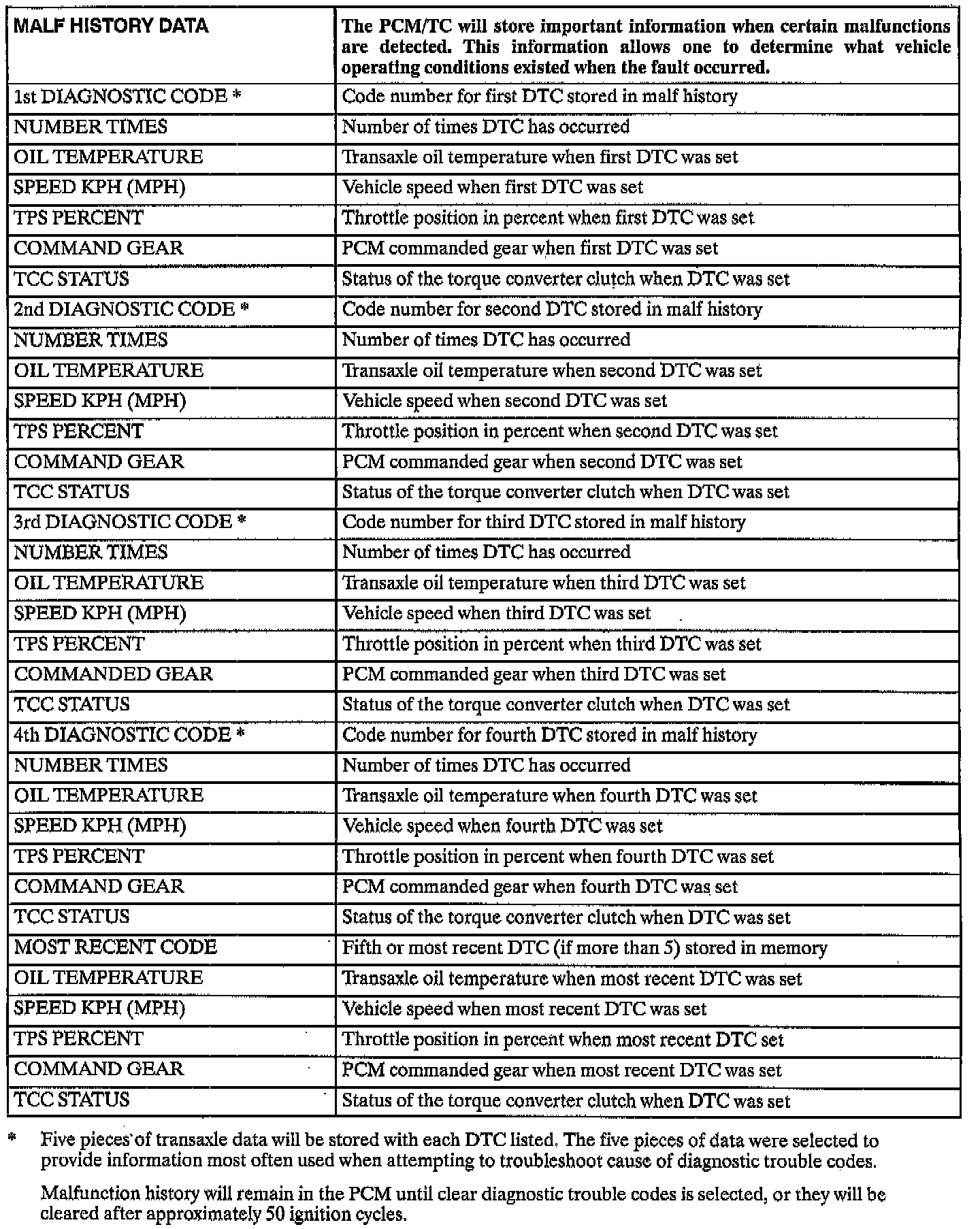 The PCM/Transaxle Controller (TC) will store important information when certain malfunctions are detected. This information allow one to determine what vehicle operating conditions existed when the fault occurred.