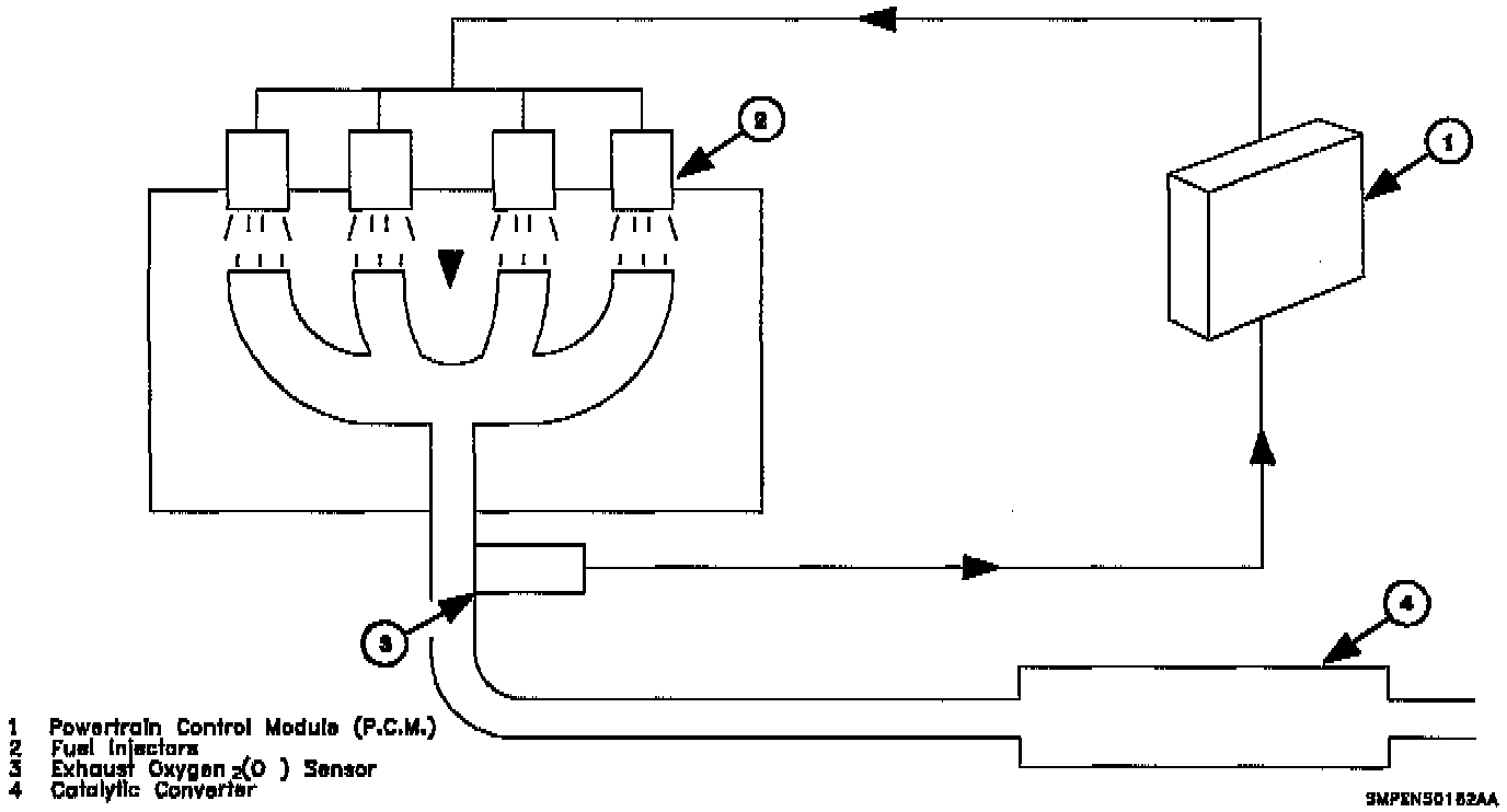 During closed loop operation, the main control sensor is the oxygen sensor, which is located in the exhaust manifold. This sensor indicates to the PCM how much oxygen is in the exhaust gas, and the PCM changes the fuel to the engine based on this information by controlling how long the fuel injectors are pulsed. The best mixture to minimize exhaust emissions is 14.7:1 air/fuel ratio, which allows the three way catalytic converter to operate most-efficiently. Because of the constant measuring and adjusting of the air/fuel ratio, the fuel injection system is called a Closed Loop system.