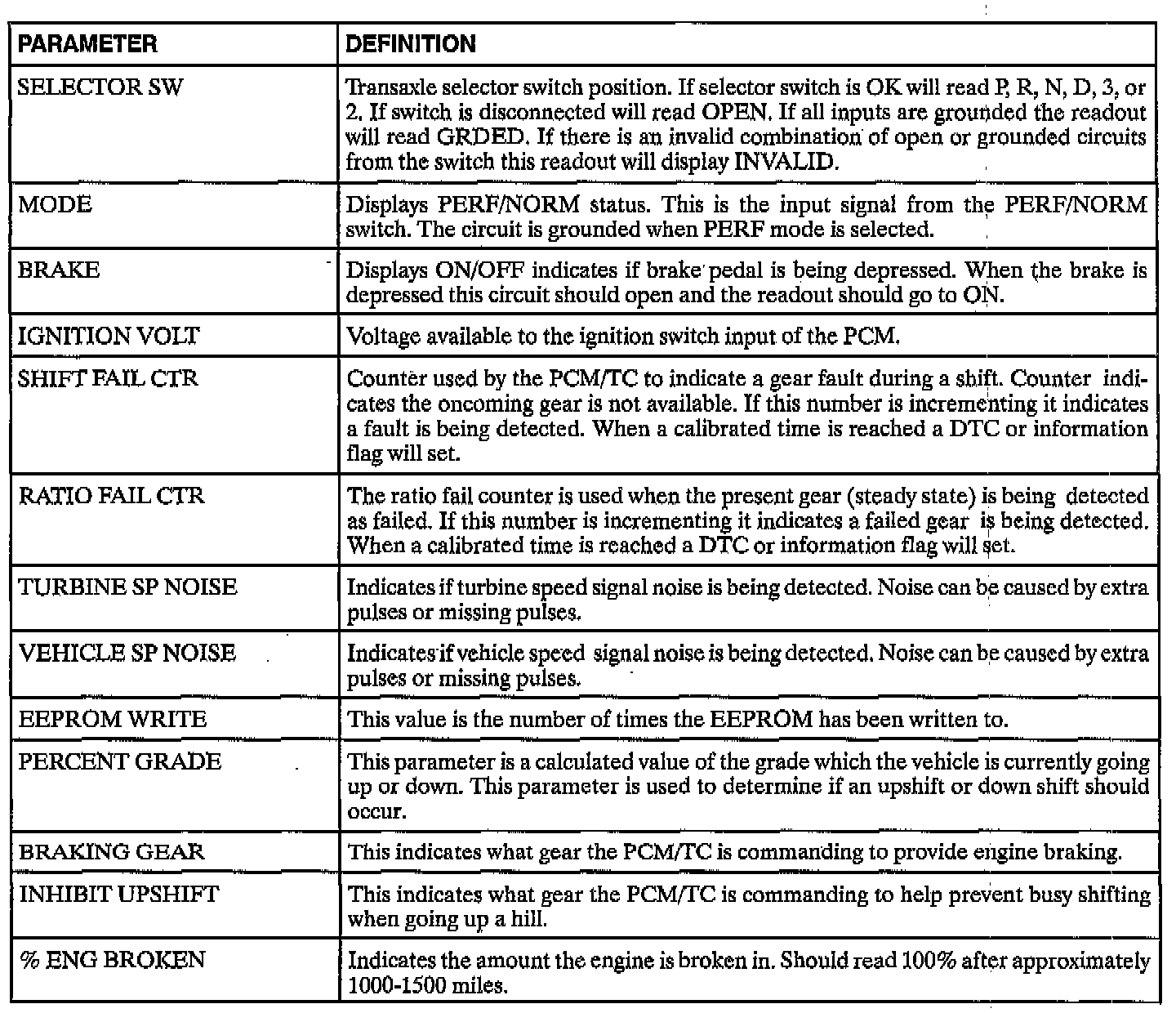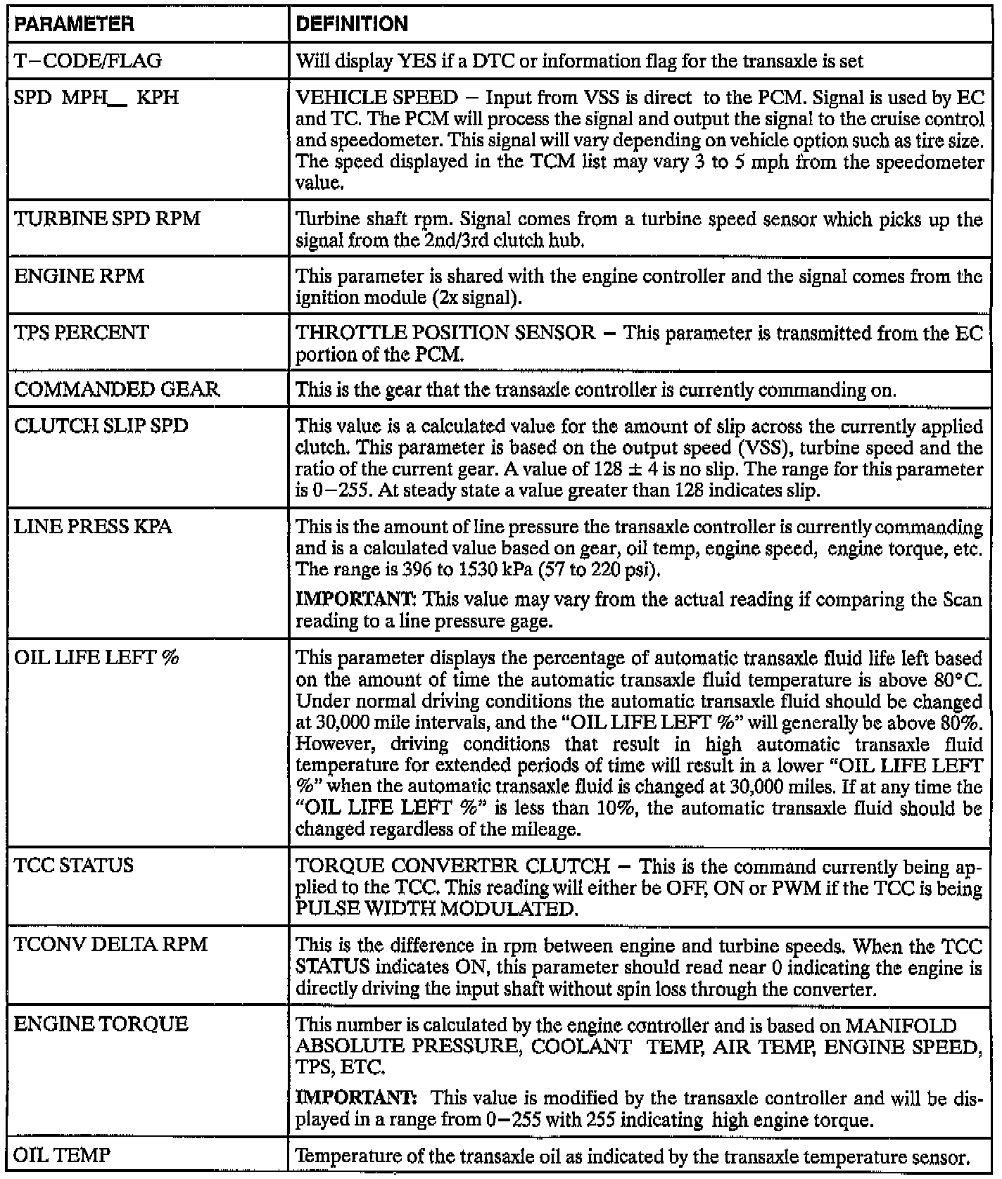 The following TCM data definitions are intended to assist in understanding the data displayed by a scan tool when it is communicating with the transaxle controller. A thorough understanding of this data will not only aid in diagnosing transaxle related problems, but will also help eliminate repairs.