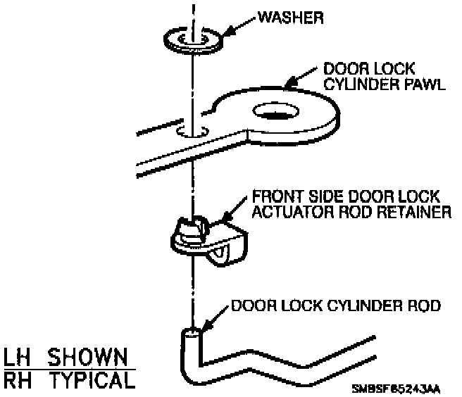 5. Install door lock cylinder rod into front side door lock actuator rod retainer, door lock cylinder pawl and washer; then engage door lock cylinder rod to front side door lock actuator rod retainer.