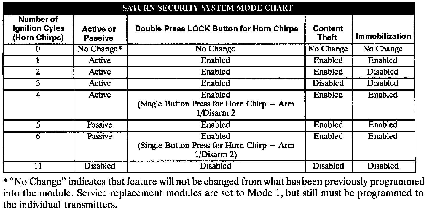 The Saturn Security System can be programmed to any of the following modes; however, unless otherwise requested by the customer, the Saturn Security System should be programmed to mode 1. If the customer requests the passive arming feature to be enabled, use mode 5.