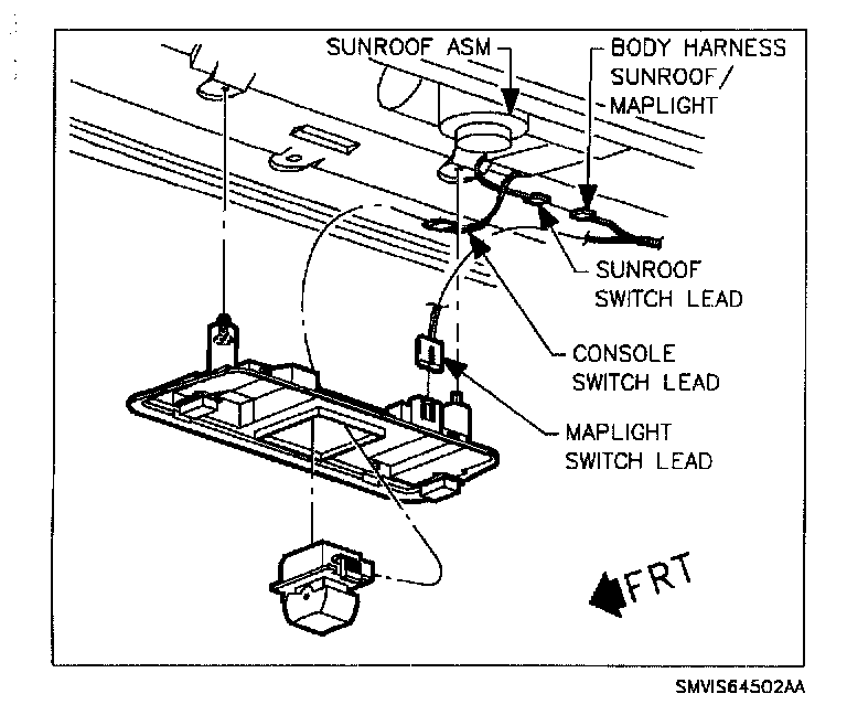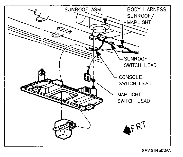2. Remove map lamp base assembly from roof console assembly and disconnect wire connector to sunroof switch.